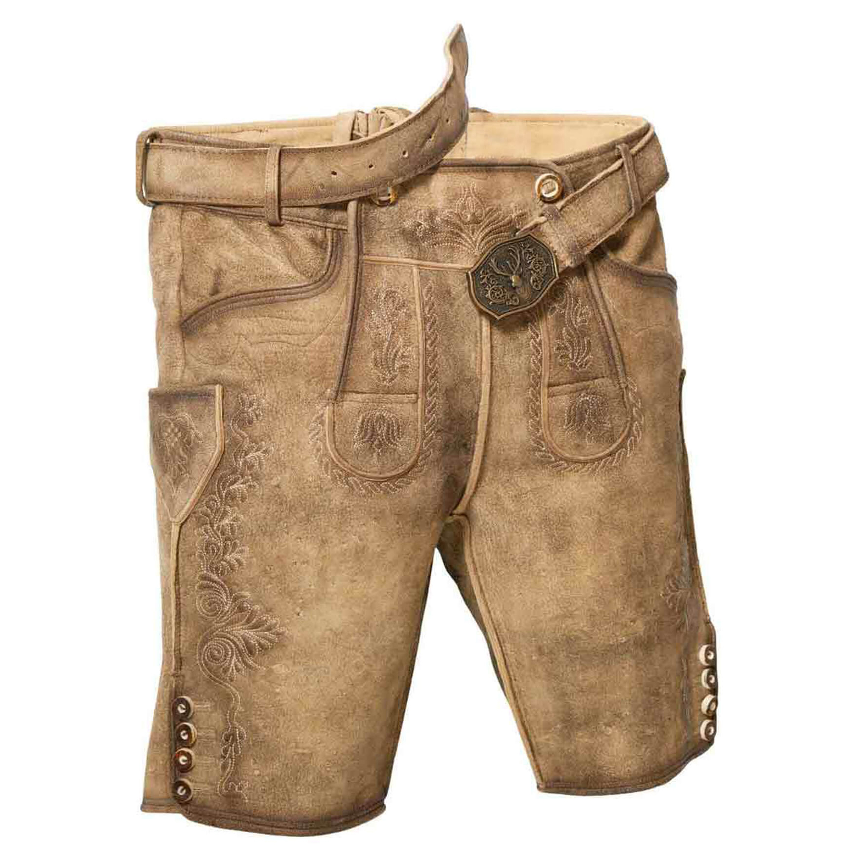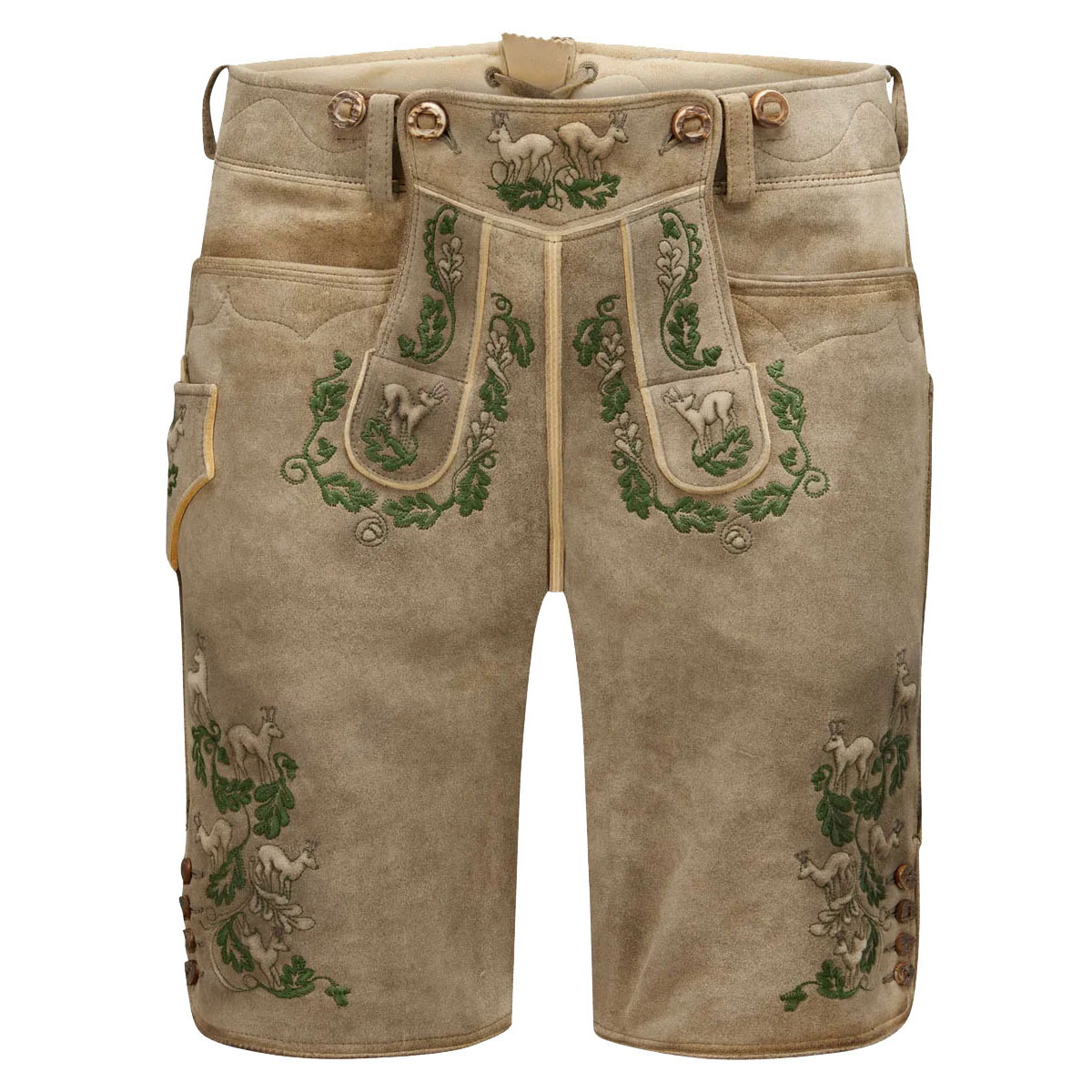 Crafted from premium leather, these lederhosen feature intricate green embroidery that highlights their unique design.